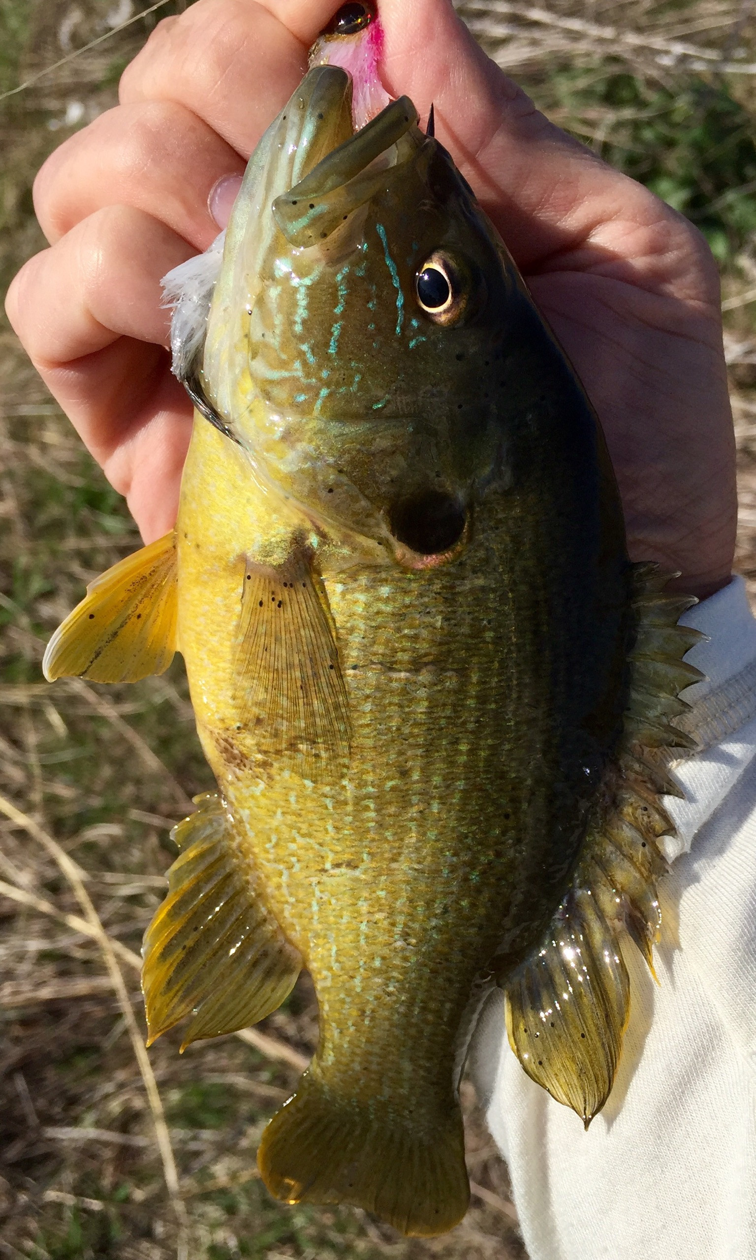 This pond get’s horribly algae covered in the summer, but right now there isn’t any. It doesn’t appear to be very deep, but the fish survived this past winter, so its deep enough. I tried topwater with no results. I used 2 different Gamechangers and caught fish on both. I caught a couple bluegills and this Green Sunfish: