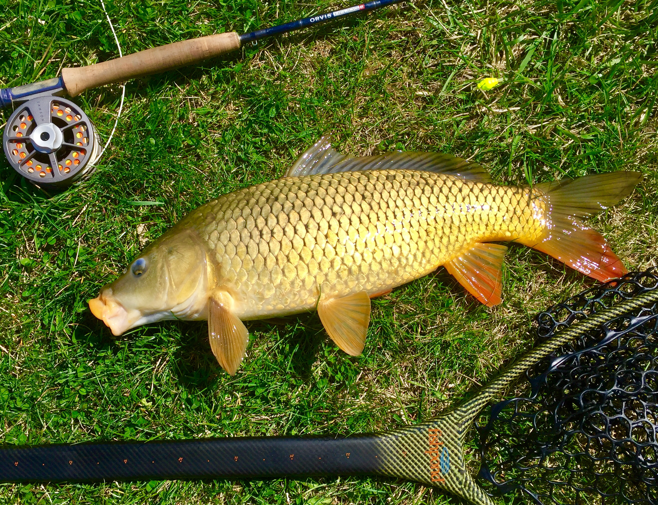 While crappie fishing with a microjig under an indicator, I watched as a carp appeared and swam right over to the microjig and ate it. I set the hook and the fun started. Glad I brought my net!