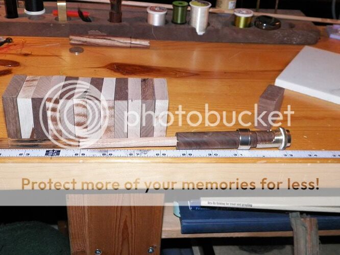 The reel seat and grip for this beauty turned out to be a slight challenge. The original grip was a peace of turned soft-wood that was covered in thin cork. This grip served as an attachment point for 2" of the rod as well as the base for the reel seat sleeve. The new grip needed to be strong to handle the stress from fighting a strong fish as well as casting the rod, all while looking good. This was solved by deciding to turn a fully wooden polychromatic grip consisting of 1/2" maple and walnut peaces, with a 3/4" peace for the up-locking hood. (Just a note all of the wood used for the grip, came from Shop scrap.) To attach the reel seat I will need to turn a hardwood dowel to fit into the grip and the seat and meeting at the but of the rod. The seat wood is a beautiful hand turned maple with chrome up-locking hardware.[