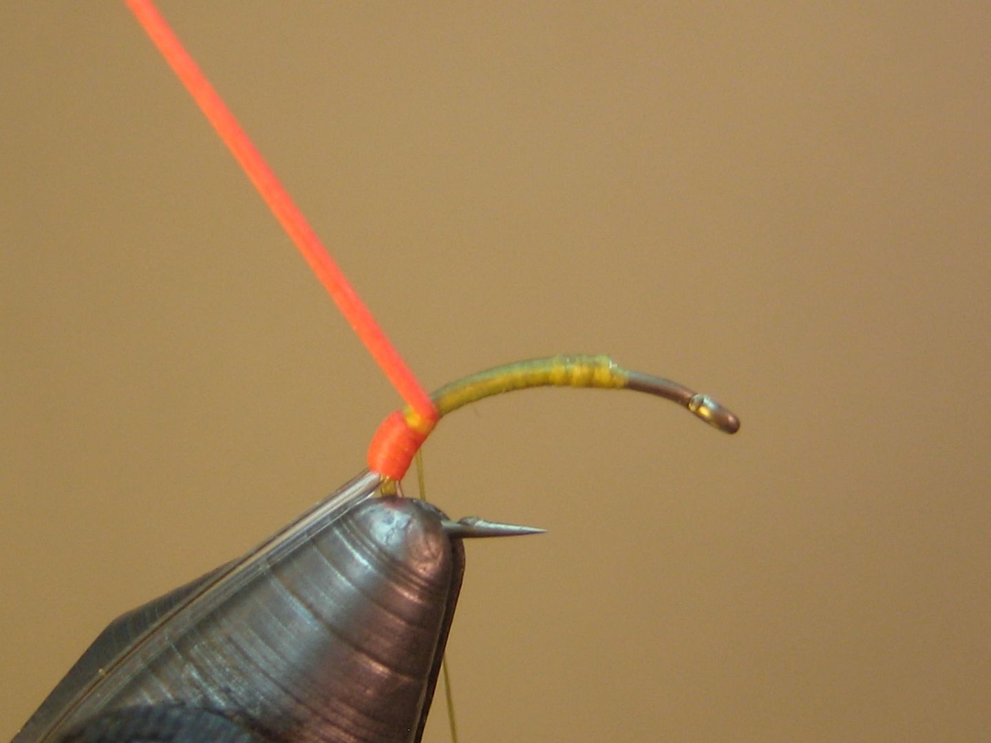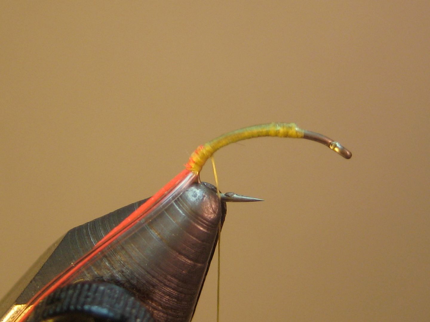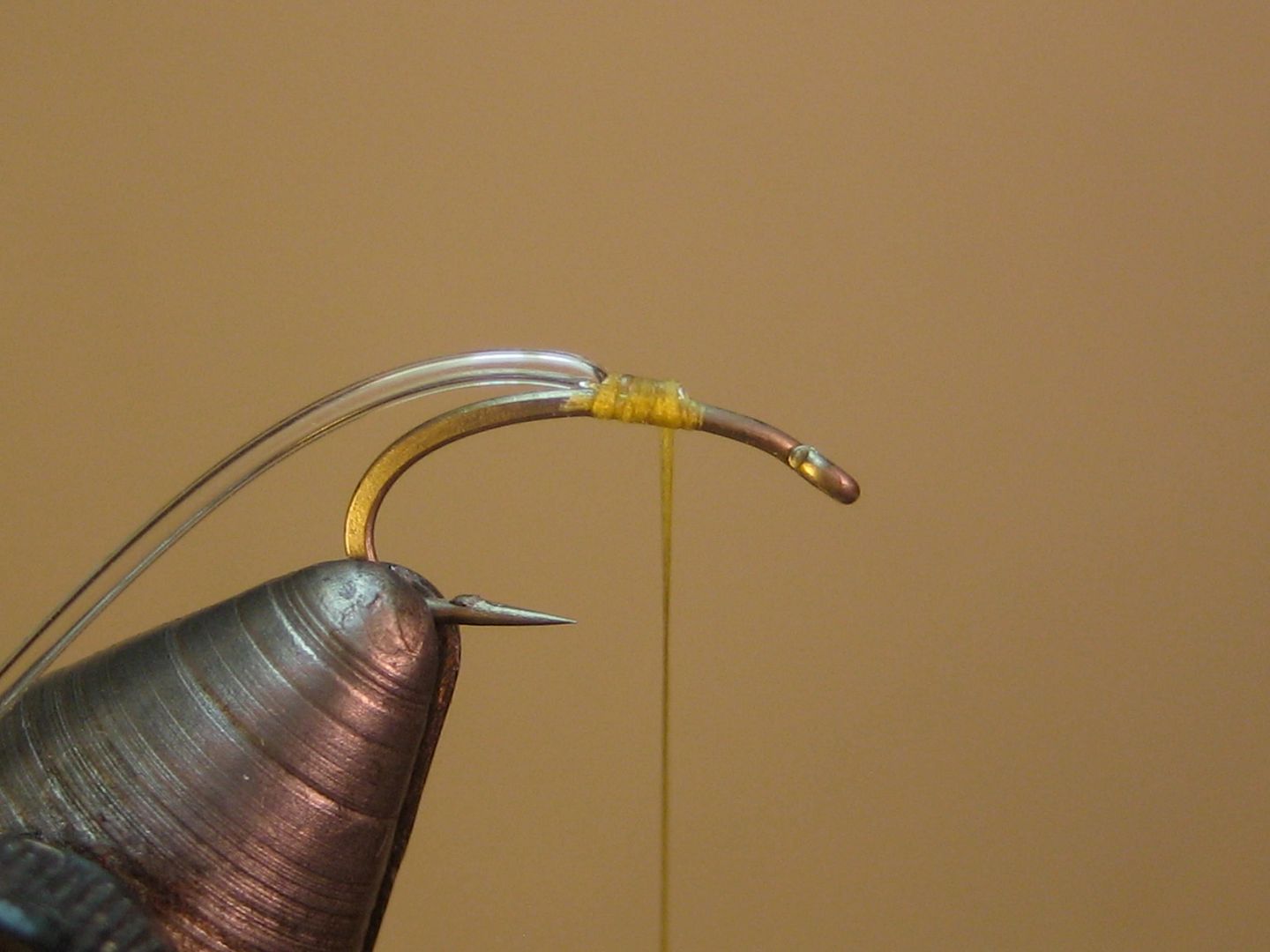 Mash down barb and attach thread at head 2/3 mark; tie in tubing and wrap back halfway down the bend