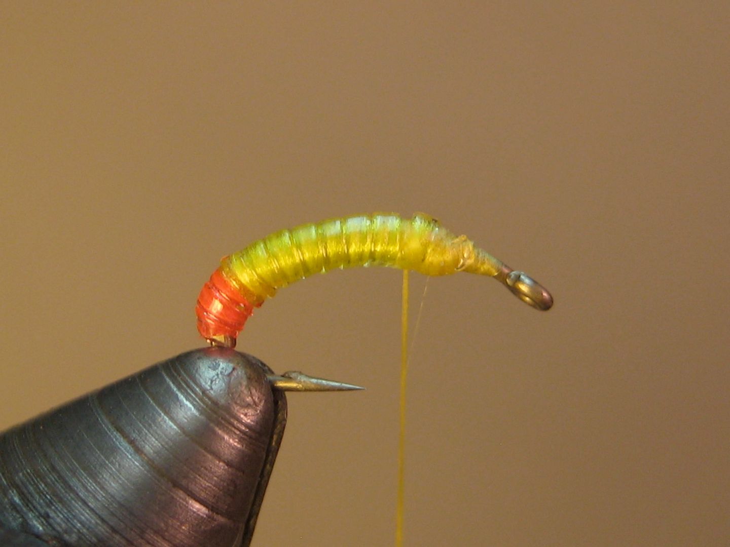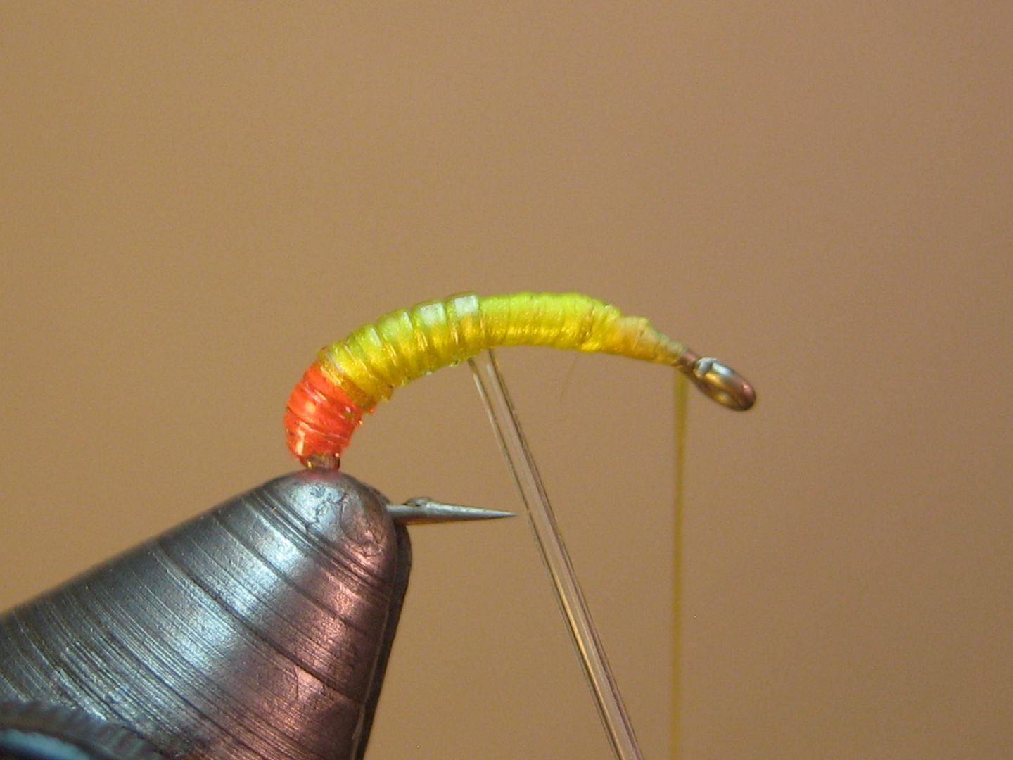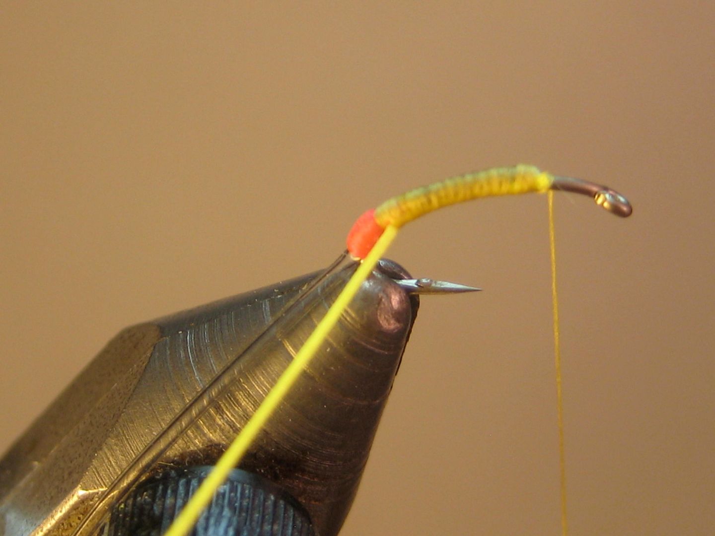 Mash down barb and attach thread at head 2/3 mark; tie in tubing and wrap back halfway down the bend
