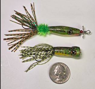 I enjoy carving topwater patterns for the bass here in Central Florida. Here are two more that work well for me. The top one I call Prop Job for obvious reasons. It creates a bit of disturbance which often draws reflext strikes from bass. THe bottom one I call a cigar popper because of the bulky body shape. The both have single inline hooks in the point up position to minimize snagging weeds.