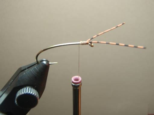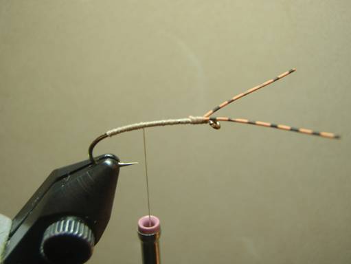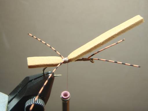 Cut a foam strip about twice the length of the hook shank and rather narrow. With the end extending past the bend of the hook, tie in the foam strip just behind mid shank.
