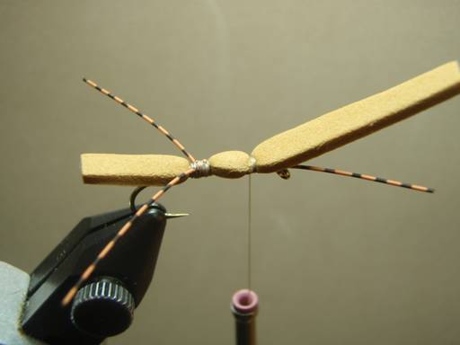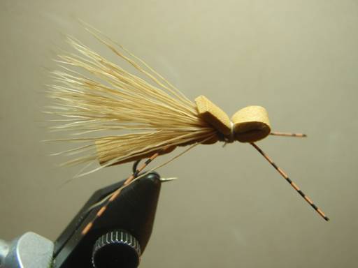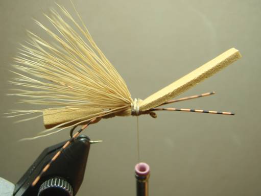 Cut, comb, stack, and trim to length a rather small bundle of deer hair. The wing should extend noticeably beyond the end of the foam body and ideally will hold fairly close to the body rather than flare out too much. But not to worry, the fly I fished on Rock Creek had a lot of flare, and did quite well. Take a good number of wraps through the butts of the deer hair to secure it in place.