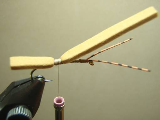 Hold up the foam strip up and wrap tying thread forward to about the one third mark on the shank. Tie down the foam strip, creating a small segment of foam between the two tie in points. (You can simply tie down the foam strip as you advance the thread, but the small segment of foam will enhance floatation.)