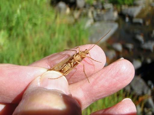 Had the good fortune to capture a live one a couple weeks ago – an October Caddis on the Crooked Fork Creek in Northern Idaho. The thing that struck me, compared to my recollections of other specimens I have been able to get my hands on was how “leggy” this big fall caddis is. Another thing about this particular insect was how uniformly colored it was. While there were varying tones on different parts of the fly, the basic shade was a slightly orange medium tan.