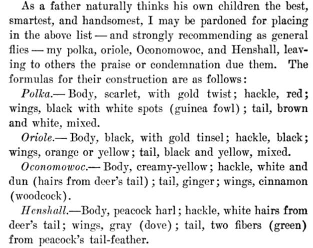 I tied these flies based on an interpretation of Henshall’s dressing before I found them in the book. I need to try them again with the deer hair and other items.