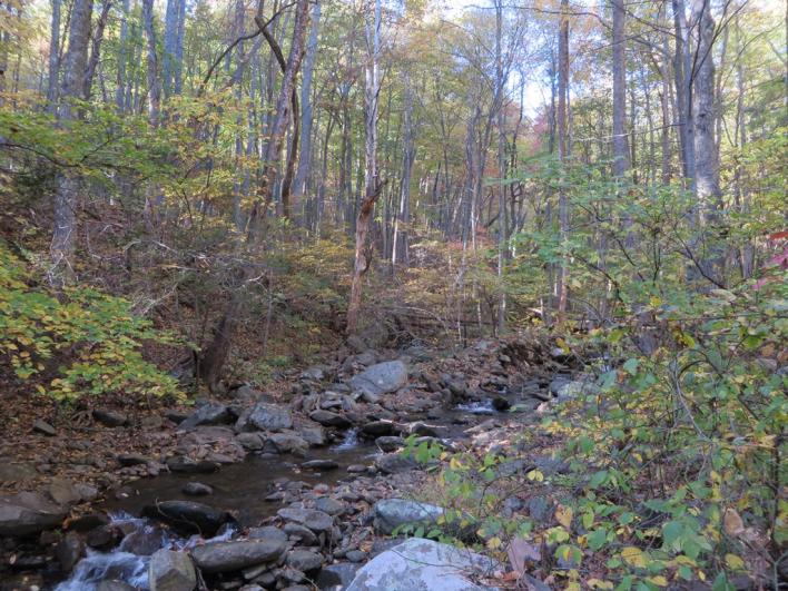 Friday afternoon I arranged my affairs to leave work just early enough to stop at a stream before heading home without being late to the boss and kids. It had been a while since I had made it up to the Blue Ridge, and I was anxious to go before all the leaves were gone. I drove to one of the half-dozen or so wild trout streams in my area and accessed it from the lower end. After rigging up my 8’ 4wt rod and loading my gear into my backpack, I had just under 30 minutes before I had to leave and make it home on time. I parked at the end of a county road right next to some trees with National Forest boundary markings on them, and right across the creek from a house guarded by a dilapidated bridge and knocked-down gate with a No Tresspassing sign still attached. The bank I was on was public property however, and that is where I intended to stay.