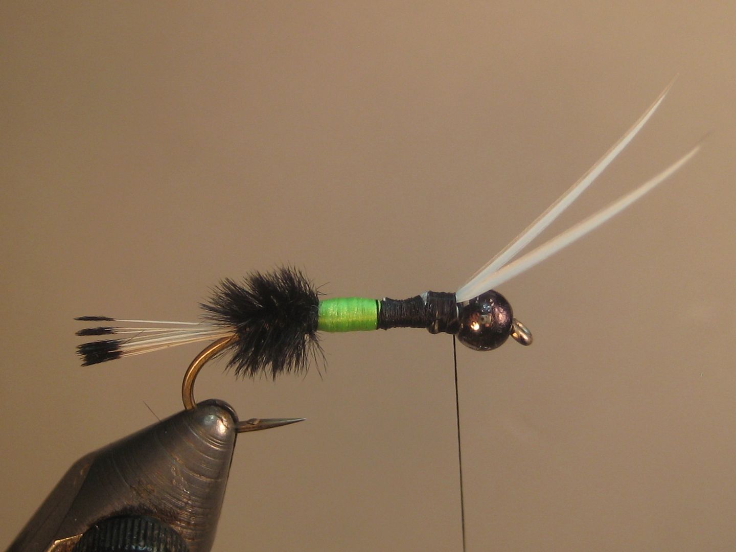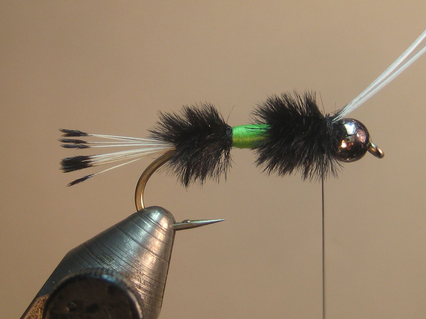 mash barb, slide bead on hook, take a few wraps of non-tox and jam it in the backside, start thread, wrap to bend