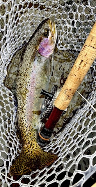 Caught 2 rainbows and a brown stripping an olive woolly bugger. This one was a fat 16-incher. I was surprised they chased a streamer in 38 degree water. It was fun being n the water although the water and air temp were about the same.