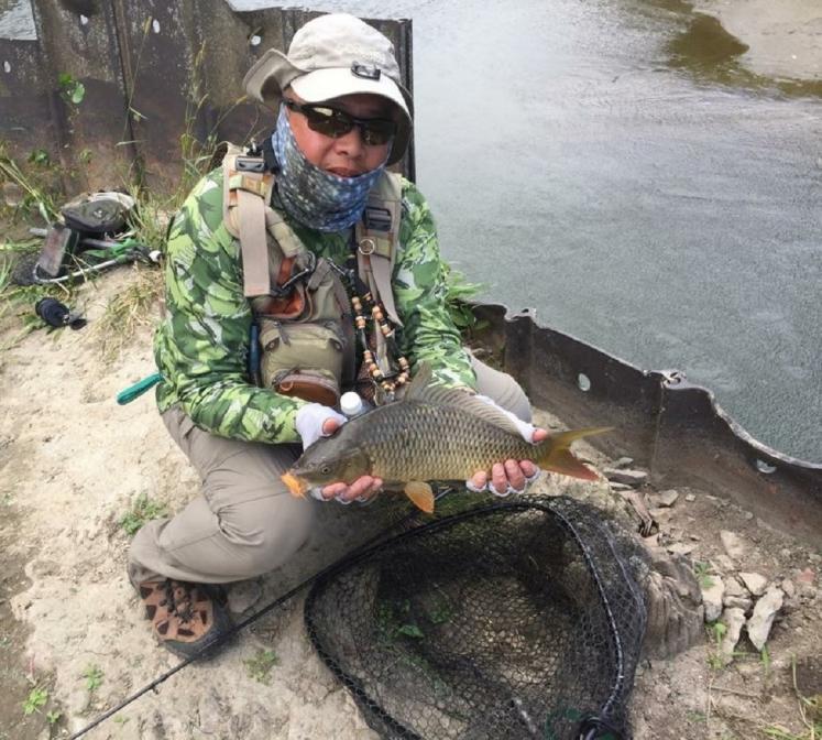 I was sight-casting to a pod of common carp using a pink San Juan worm, when this fat flatty that was hiding under a ledge carp-blocked me! Made up for it, by sight-casting to the little common. Tight lines!