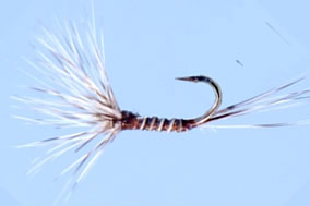 The Funnel DunThe simplest version of an upside down dun fly was created by Niel Patterson as the ?funnel dun?, this pattern uses the same hackle as regular Catskill tied or Halfordian creations, but it is forced into a cone or funnel shape, combined with the tail being tied markedly around the bend of the hook the fly has a distinct propensity to land ?the wrong way up? thereby ?hiding the hook point?. It is certainly much simpler to manufacture than Goddard and Clarke?s pattern, but I have to confess it lacks aesthetic appeal to my eye. (I have a soft spot for fishing with pretty looking flies I?m afraid).