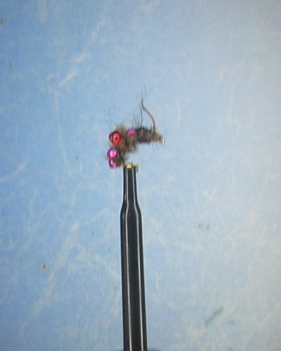 Scud hook , 5 beads threaded onto thread and then tied down to hook shank, middle bead larger, ostrich herl wrapped between beads