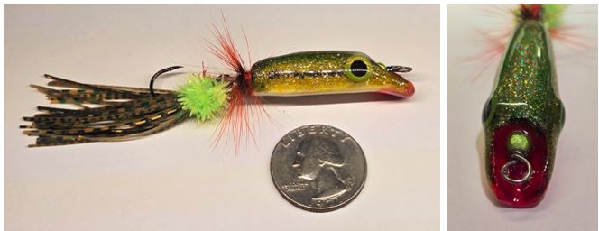 I enjoy trying new ideas when making my Balsa Bugs. I ended up designing a gurgle popper that also dives a couple of inches with each rapid strip. The elongated lower lip really digs in, moving a lot of water and getting the attention from a good distance away. Fun to make and fun to catch fish with.