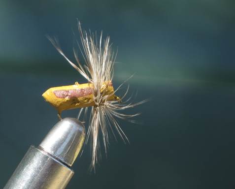 Here we have a basic hopper that is constructed from mostly native materials. The hook is about a size 12, the body is a willow twig that was split and glued on the hook and then was painted yellow. The brown strip on the side represented the legs, and then he cut a groove around the body and made a couple wraps of grizzly hackle. As crude as it appears it does everything that a good dry hopper pattern should do. It lands on the water with a satisfying plop, it floats without the need of any floatant, and it resembles the real thing.