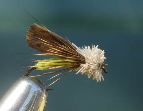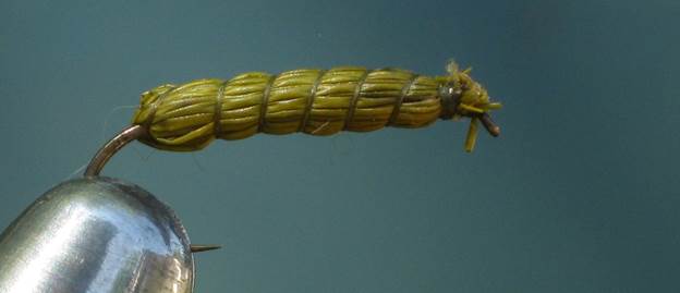 This fly was tied on a long shank hook and consists entirely of deer hair dyed green. The hair is tied in by the tips and the tying thread is wrapped over the deer hair to the bend of the hook. Then the deer hair is pulled forward completely covering the hook shank and the tying tread is spiral wrapped back to the eye and tied off. I also tied a similar fly by spinning green deer hair over the entire hook shank and clipping it into a round or tapered shape. In Michigan, along the Au Sable River the oak trees that grew along the banks in places were normally infested with these green worms and when they lowered themselves down on their silken lines they often would end up in the water. When they were dropping out of the trees it was often possible to find several good brown trout holding right under the trees and eating the caterpillars as they hit the water. Green caterpillars are quite common and many types of streamside vegetation and this is a good pattern to have in your terrestrial box.
