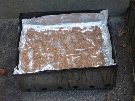 Line the smoker with aluminum foil and sprinkle a hand-full of Sawdust or fine wood chips over the foil. I use Manuka sawdust as it is the Kiwi favorite, but you can use any wood you like as long as it is not chemically treated wood. Some good ones to try are Hickory, Oak, Apple and Pear wood. Do not use Pine unless you want your fish to taste like Retsina! You can also add Green tea or dried herbs to the sawdust to add even more flavour.