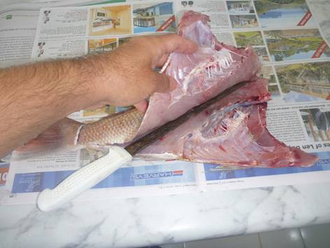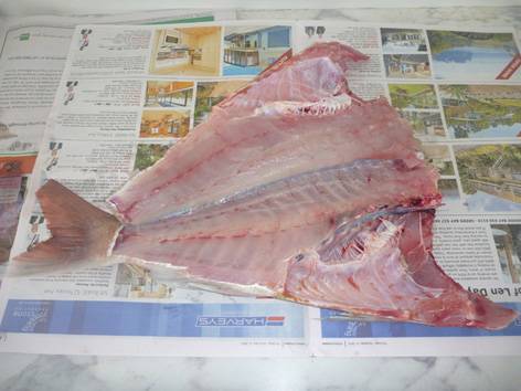 To butterfly your fish lay it on a flat surface, lift the belly flap and cut through the rib cage as close to the spine as you can. Run the knife along the rib cage and then all the way down the fish toward the tail, cutting through the flesh and using the spine as a guide. Do not cut all the way through the skin. This sounds complicated but is very easy and hopefully you will get a good idea from the photograph.