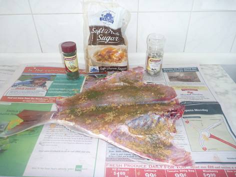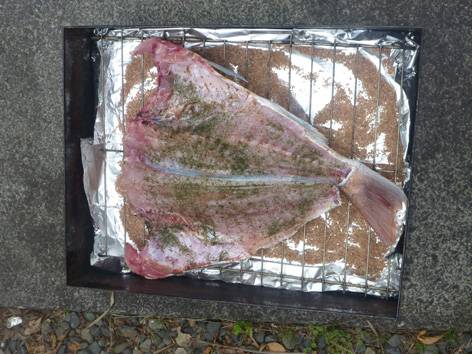 Once the fish is butterflied sprinkle over a hand-full of brown sugar and lightly rub it in to the flesh. Then sprinkle over plenty of salt, and then some Dill, or any other herb you like with fish and finish with a good grind of pepper. Allow the fish to marinate while you prepare the smoker.