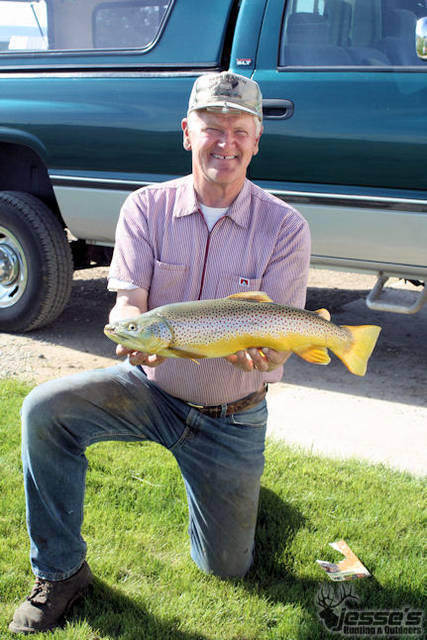 We have a small, 1 acre, hand dug reservoir on our ranch. The reservoir was dug about 60 years ago and has never been planted with trout and is fed by a small ditch. The only time to fish this reservoir is in the spring before the weeds make fishing nearly impossible. Dad caught this beautiful male German Brown today on a small dry fly (pattern that he created). It weighed 5 lbs and measured 23 inches from snout to fork in tail. I was surprised at the beautiful gold color, I’ve never seen one so yellow. I’ve caught two fish just a tad smaller than this one, and dad has caught about 4 a little smaller than this one from this reservoir over the past 8 years. We maybe harvest about 1-2 fish out of the reservoir each year (my father-in-law likes them for breakfast), but mostly it is just catch and release. This fish is the limit this year. I’m looking forward to cedar planked grilled trout tonight with some bacon, lemon, dill, and garlic!