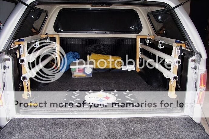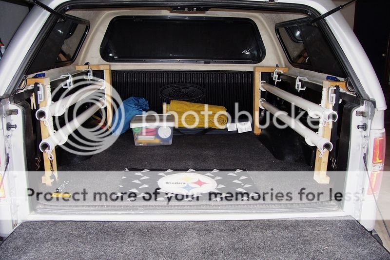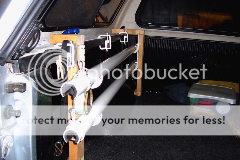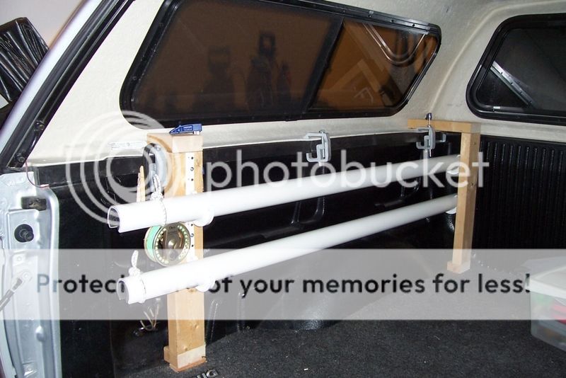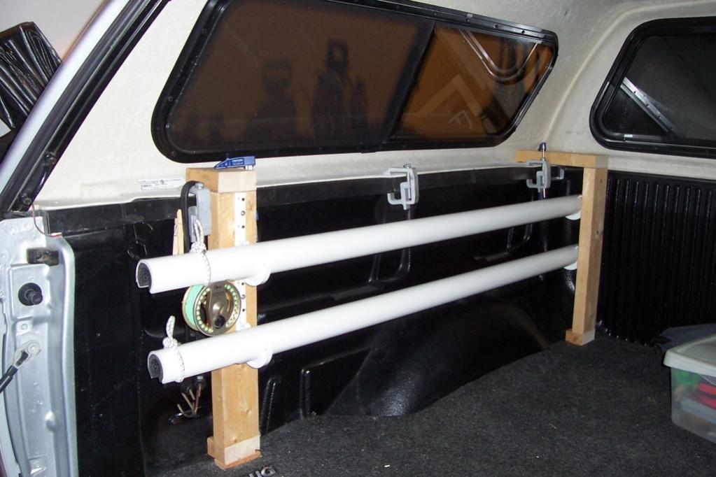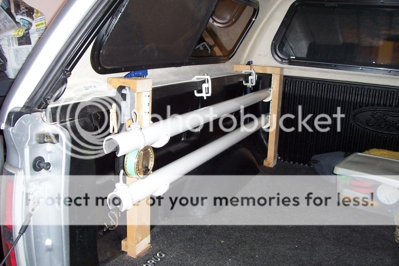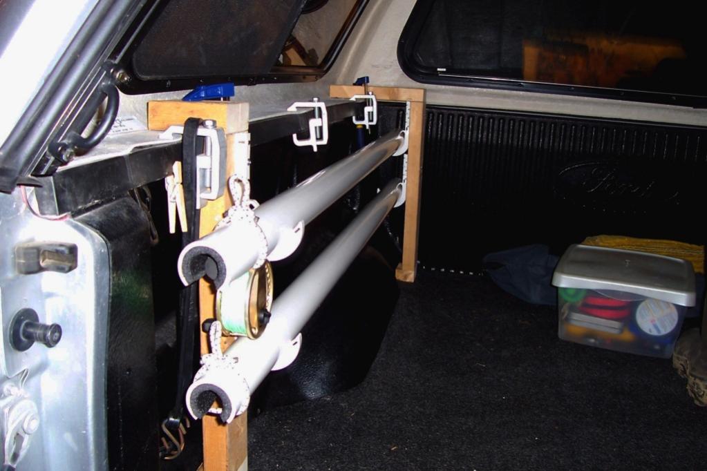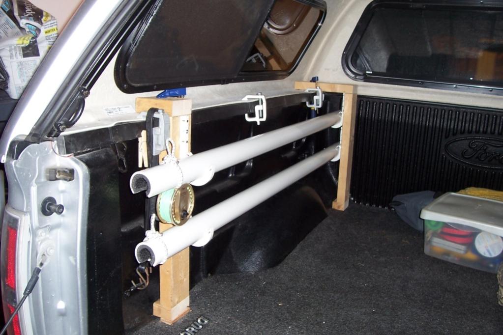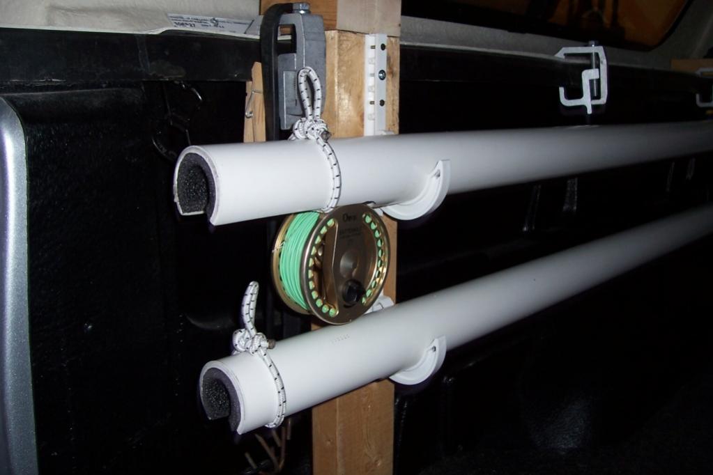 Well, I got inspired and finally build a set for my truck (2010 Ford 150 SuperCrew Short Bed) using Brads basic concept. The heart of the system is 5 foot lengths of 2" schedule 40 PVC. The inside of the PVC is padded with 1" water pipe insulation. I used a hole cutter on my drill to get a nice radius in the PVC and a jig saw to cut the clearance for the reels. 3/8" bungee is used to secure the rods and reels in place.
