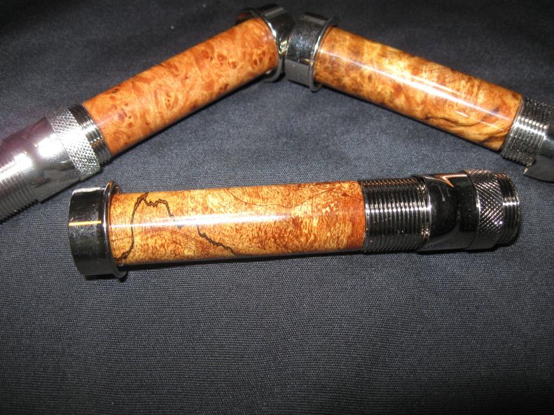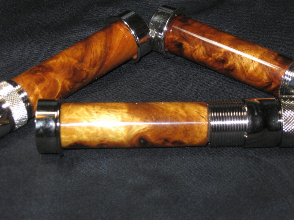 These reel seats were just completed today. I am picky on the wood to be turned, so I look to find attractive wood. Even at that once you start the project there is no way to know exactly what the color and grain will be when completed. I am happy with all of these. The burled inserts are from Maple, Rosewood and Amboyna