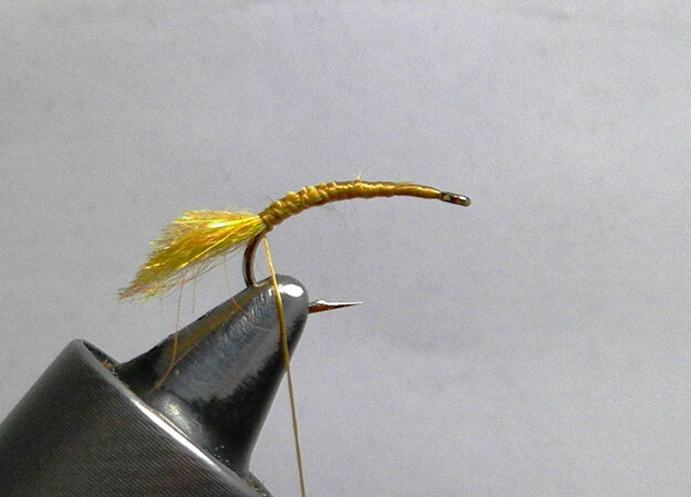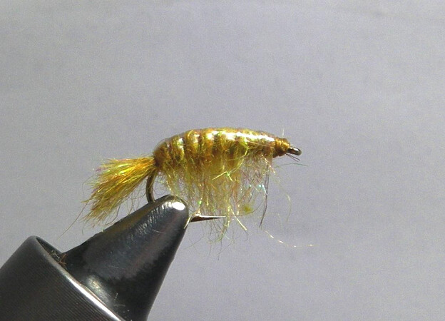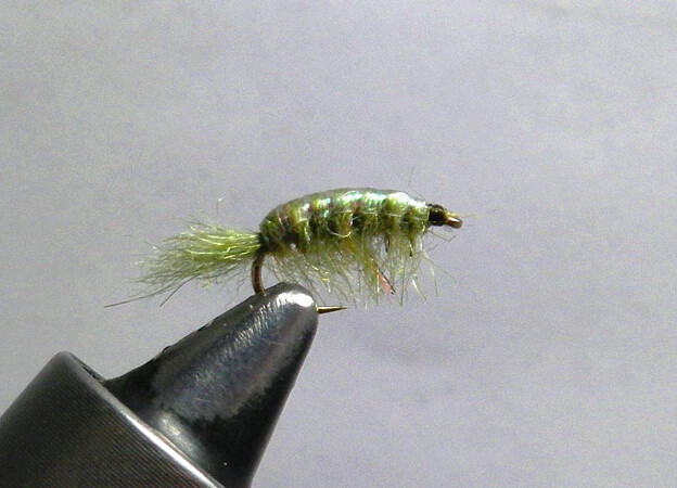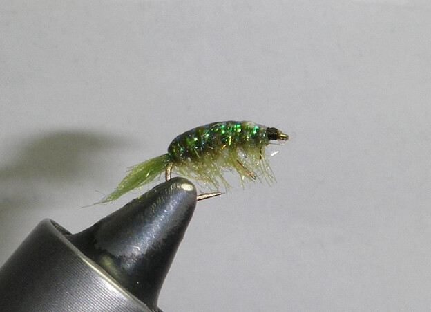Olive version, wet. This shows why I use the Krystal Flash as a ribbing material. When wet this fly really does look like the real thing and the fish love it.
