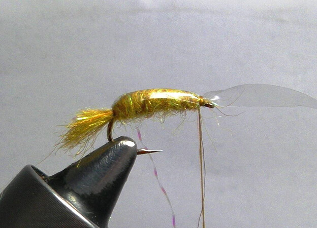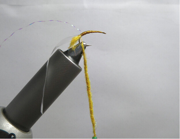 Rib fly with Krystal Flash material and tie off – as shown. Don’t pull too hard on the ribbing material as it will stretch and ofttimes break. Trim excess ribbing and shellback materials. Tie off thread