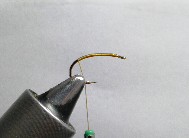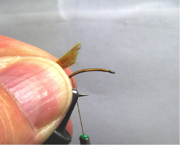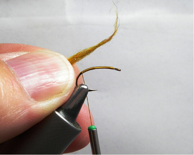 Apply dubbing material to tying thread with thread at the back of the hook. Tying tip: apply dubbing to your thread by rolling it counterclockwise, this prevents the material from unwinding as you wind the material on the hook (right-handed tiers).