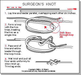 This knot may be used to join two lines or to form a loop; for the loop simply double the standing part and use just one line. It is preferred by many to join tippet to leader. Really an overhand knot with one additional turn, it can be enhanced further by adding yet another, but for most usage it is not needed. Many like it as you can actually tie it without looking at it; you can feel it forming, very useful in the dim light of a spinner fall when you need to change to a new tippet.