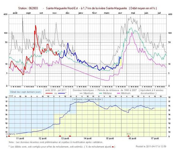 Flow rates on the North arm of the Ste-Marguerite. The top graph shows the year (red and blue) Green is the 9 year average; Grey and purple are historical highs and lows respectively.