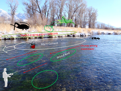 Though it might be hard to imagine with snow on the ground, grass will grow tall and over-hang along Middle Section during summer months. Trout are at same holding spots where they have awaited aquatic foods tumbling toward their months during winter months. In summer, trout anticipate terrestrials floating above and are ready to take them on surface.
