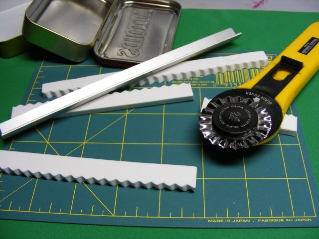 I borrowed the wife’s rotary cutter with a pinking shear blade. With a straight edge you can make strips really quick and accurate. Use a razor blade for the straight cuts. Be sure to use a cutting board..