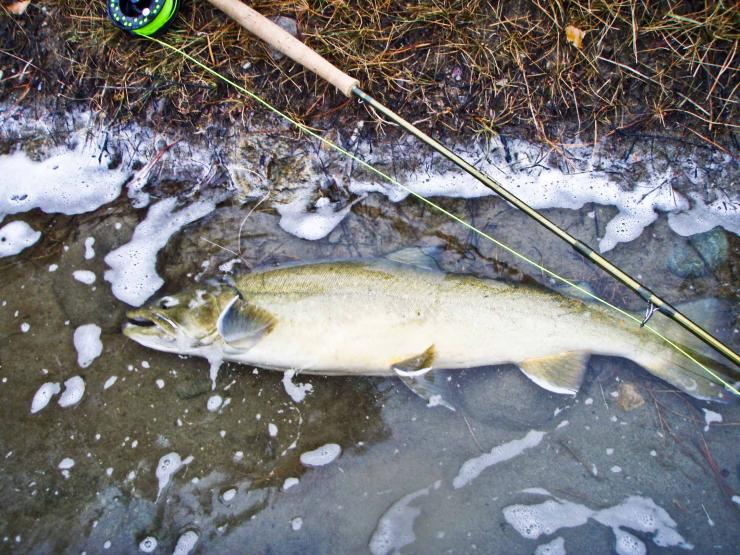 look at the fish but it was not a steelhead but a very large Bull trout. I finally managed to get the fish to the net, unhook it, and snap a picture to share with everyone… and with a very gentle back and forth it swam away. What a magnificent fish. I did have a brief encounter in the early afternoon with a steelhead but it ended with a LDR as the fish sprinted up river and then jumped and spit the hook. It was great just