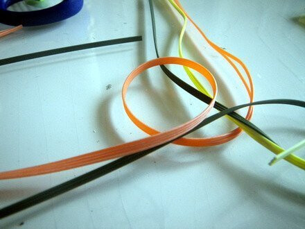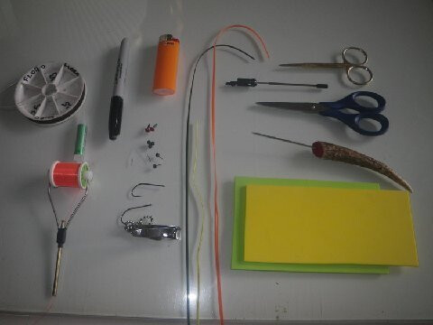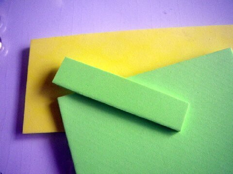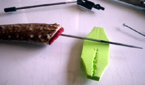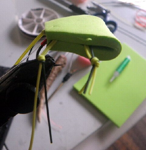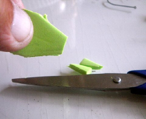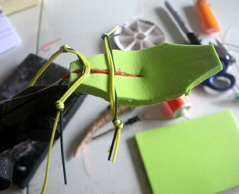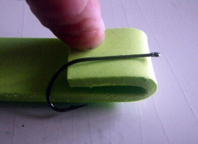 3rd - take the foam and cut a strip about the width of your thumb…if you are a giant then use your pinky…yellow and/or green is killer…the foam comes in different sizes…choose your weapon wisely grasshopper…then bend it in half and cut it…use a spare hook for a gauge…I left you one in the top picture just for that, see for yourself…then cut it as shown while folded…rough cut is fine so don’t freak