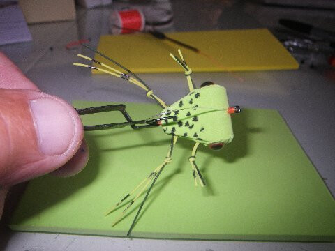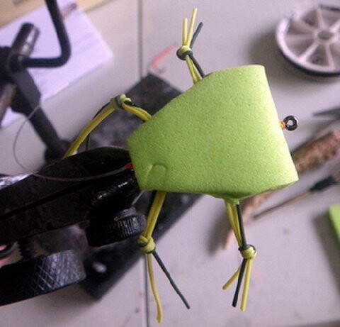 This is a very simple pattern that I didn’t bother to use a vice to make…the only drawback was the frog would eventually get pulled off the hook…at the time it didn’t matter anyway because Mr Frog was getting the pounding of his life just the same…I used small hooks I found laying around and watched football and “pinched” together dozens of frogs.you will see what I mean if you follow along…now with a little effort (but not much) they are basically bulletproof and a little more fun to make…I can’t help myself when I see the legs pump in the water, so primal and simple but so brutally effective on the fish as well…ok, I will try to keep this simple and clean with lots of pictures that really tell the story best…dont be afraid, you cant go wrong here…