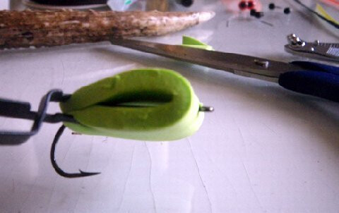 4th – take a custom bodkin like the one the mighty “coughlin” so generously sent me a few years ago and spear the middle right on the center of the fold…then abuse the frog by trenching a deep valley practically thru the entire bottom side as shown…best to be brutal about it because the boogers left over help bond the foam to the hook in about 1.5 seconds when you put the superglue…pinch it together for a few seconds when burying the hook in the foam…this will help the hook to ride downwards and make a wider gap for hookups