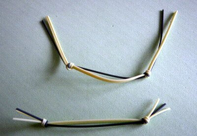 5th - time to make the legs…I use various colored rubber legs and sometimes switch around…I will use yellow and dark green for demo…don’t tie them too wide…leave one pair long for the back legs…be sure to snug and resnug the knot or it will undo…small drop of glue will secure it but be careful or you will burn it off with a “hot spot”…best to just be careful…once you got that then you can put them where they go by adding a small drop of glue to secure it until you are ready for the “pinch”