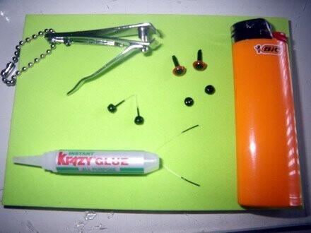 7th - add the eyes…I have shown 2 different styles…one you make from the beads, mono and superglue the other obviously I have snuffed out a teddy bear and tore its eyes out(just kidding)… get them at the fly shop to support local fly shops…forget the art stores…trim the post of the eye to short and insert like shown and THEN add drop of superglue, if not the glue will dry and bond before you can push it in place, believe me it will
