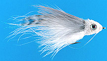 Plain ol’ Deceivers actually work very well. White, or blue over white. You can also jazz it up to look a little more mullet-ey by tying a deceiver as you would normally, but with a white marabou collar in front of the normal bucktail collar (in front of peacock herl if you use it for topping). This gives it a more round shape and pushes more water.