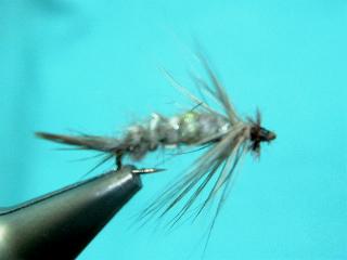 Underwing: Two strands of pearl crystal flash tied on each side of the body, directly in front of the lead wraps (where you tied off the dubbing loop for the body). I also use green of some sparkle CF for an option when fishing this fly.