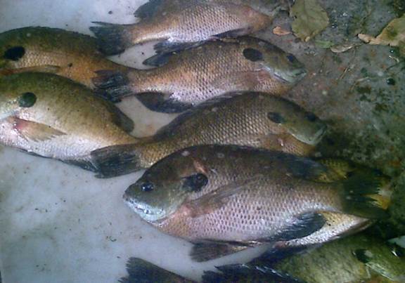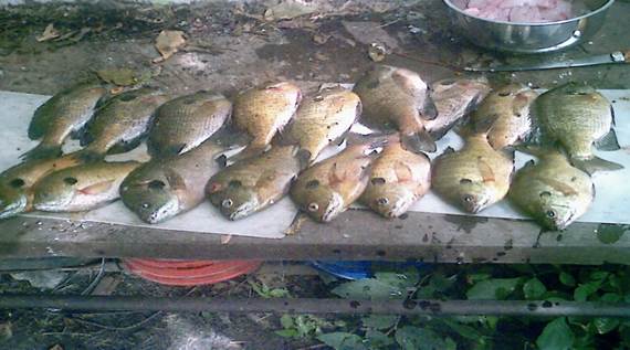 I did find a couple of huge gills in this area and I had to net them to get them in the canoe. I was afraid to lift them as they might come off the hook. They were too large to get my hands around. While I was landing them I was kicking myself for not having the camera with me. I wear size 10.5 shoes and I put these near my foot and they were longer than my foot by the length from the gill flap forward.