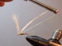 Step 5: Wrap the hackle once or twice around the post (depending of sizes and your intension; sparse for spring creeks & full for rivers). Whip finish. Trim the post for desired length.