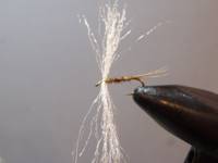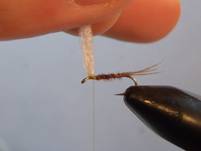 Step 1: Attach the thread to hook. Tie in a piece of wire then fibers of pheasant tail (number of fibers is depending on sizes of flies). Form a nice abdomen, reaching two-third of hook shank, tie off, and counter-wrap the wire.