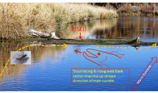 There is a log sticking out from the west bank (covered by dying weeds). This adds a very unique character to the sections otherwise wide and flat features. Insects (either on surface or slightly below) following the micro current caused by the log. There seemed to be one or two trout hanging and rising (sipping) tight to the log. Judging from their rise-forms and rings they were facing the west bank rather than the upstream direction of main current. Fishing the flat smooth main current was already difficult so how could I fish this little tight spot? I could have ignored them and focused the trout that were rising in main current. However, those trout by the log looked big. and I confess that I tend to treat myself sadistically by putting myself into tough fishing situations. I worked on this spot a lot (actually almost every day). When I gave up or ended up spooking trout for the day, I would pivot and cast to the main current catch some trout from the main current. I talked about this situation with Buzz at the Spring Creek Specialists Fly Shop (www.springcreekspecialists.com). When I took days-off from the creek Buzz worked on the spot and he told me about his success. Did I make it or even get close? I leave it up to your imagination as you would simulate yourselves “if you were in my spot”.