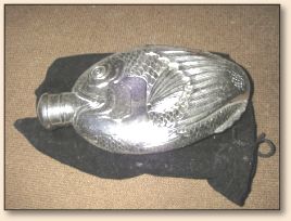 a silver pocket flask shaped like a fish, another glass