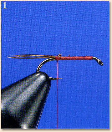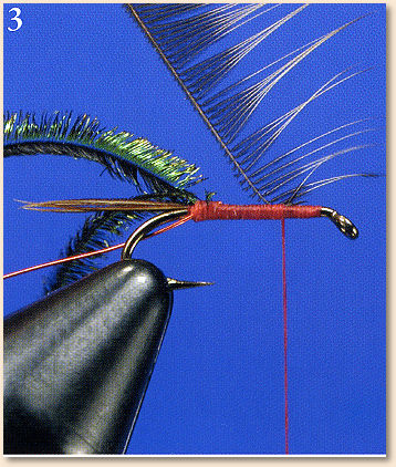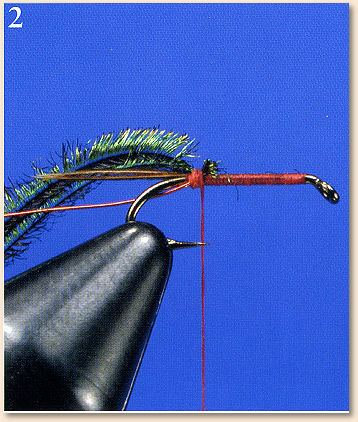 - Tie in the red wire and two to four peacock herls for the