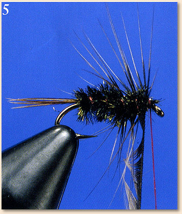 - Make two or three turns of hackle behind the hook eye and