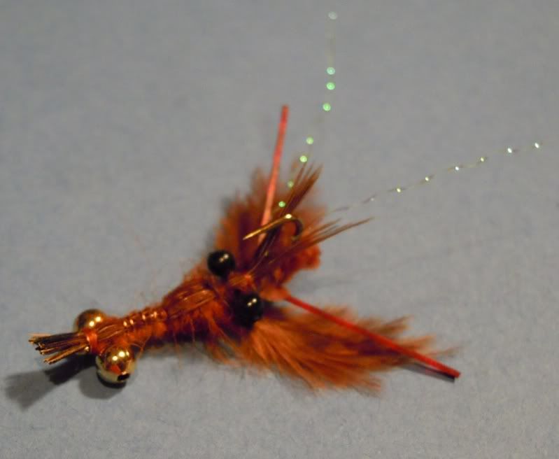 Weight: .025 Lead-Free wire around hook shank under the “thorax area” of the crayfish. Also, medium gold-colored beadchain eyes at the “tail” of the crayfish to keep the hook point riding up.