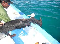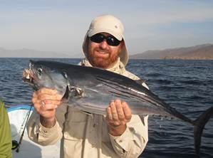 Unk and I could be found at 0515 sitting on his patio watching the sky. The Milky Way looked like overcast and shooting stars were flashing by. Sunrise was not until about 0620. It was to be somewhat a carbon copy start but we went, or were supposed to at 0615. Roosters, the birds, got the blame for not waking the guides up on time… we made it feet wet by about 7. We had a grand sunrise to keep us company. Because we had a report of big schools of busting jacks up near the bait catching we taxied up the outside of the big island and about five miles up, meeting the bait guys half way. No jacks found we went back to mount to see if something else might be there and found only the skippies again. A quick four or five apiece and Justy and I pleaded for a change. With an almost full load of sardines we started out for the beach of Justin’s first catch. The fish were doing their thing but so were the other boats. They could not get close enough to us it seemed and were scaring the fish away. The frigate birds and pelicans were also pretty active. It is a real high threat arena for the little sardines. They get tossed in the water and the pelicans dive on them and then the fish come at them from the underside making them jump and those that clear the teeth and water get grabbed by the frigates. Justin got a line wrapped around a frigates wing and it had to be pulled in and released. Not one of Justin, Marco or the bird… was really happy. A little problem with getting another load of bait to go south came up when the bait boat did not show up to pass bait. James and Unk took off north to find them and we waited an hour off the end of the island for the two boats to come down and give us fish. James had some strong words with the guys, who probably sold all the fish that should have been ours and went back to get more…making the delay.